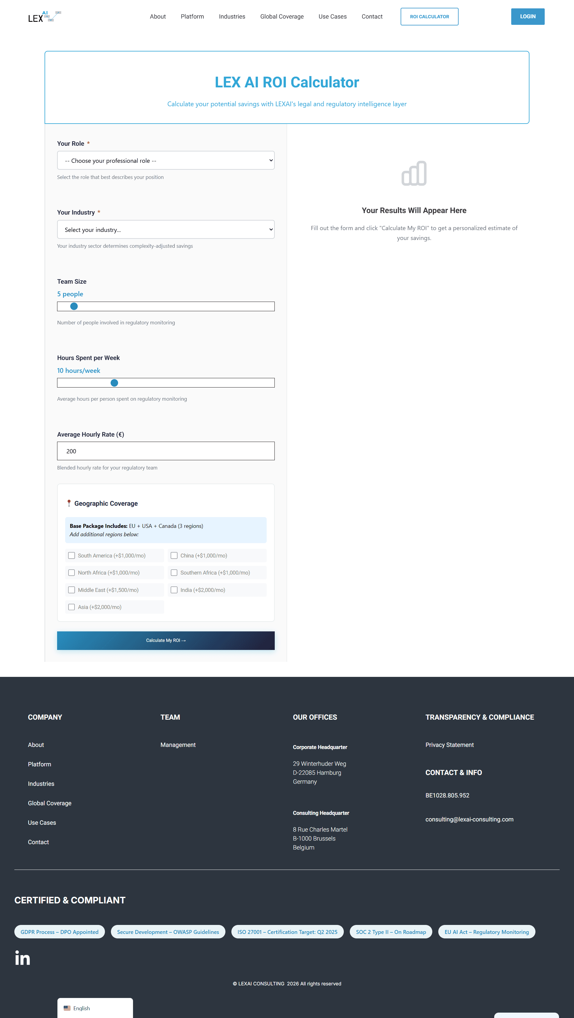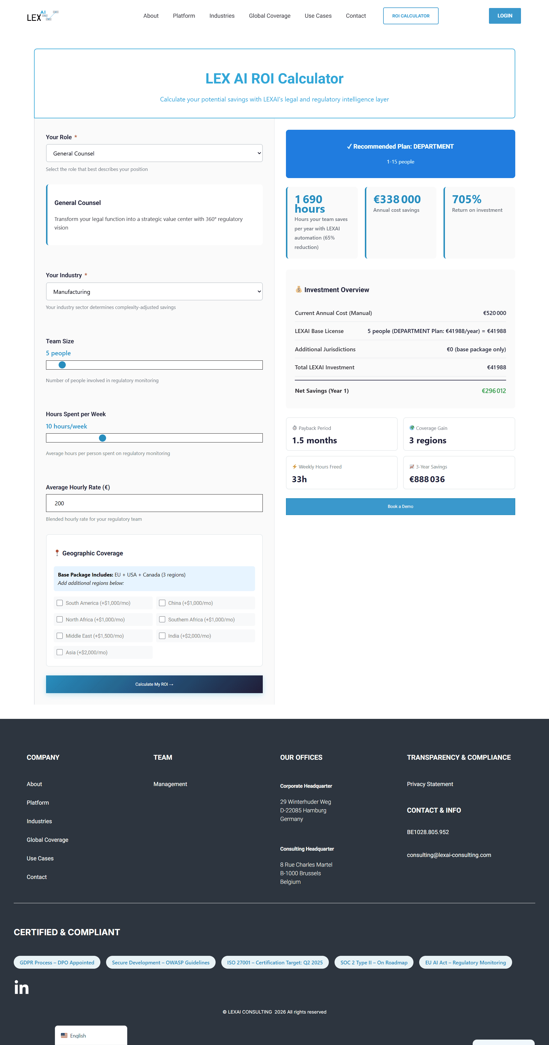 Rather than relying on vague value propositions, I integrated a real-time ROI calculator. This tool allows General Counsels and decision-makers to quantify the impact of AI consulting on their specific operational costs, removing friction and establishing immediate credibility through data-driven transparency.