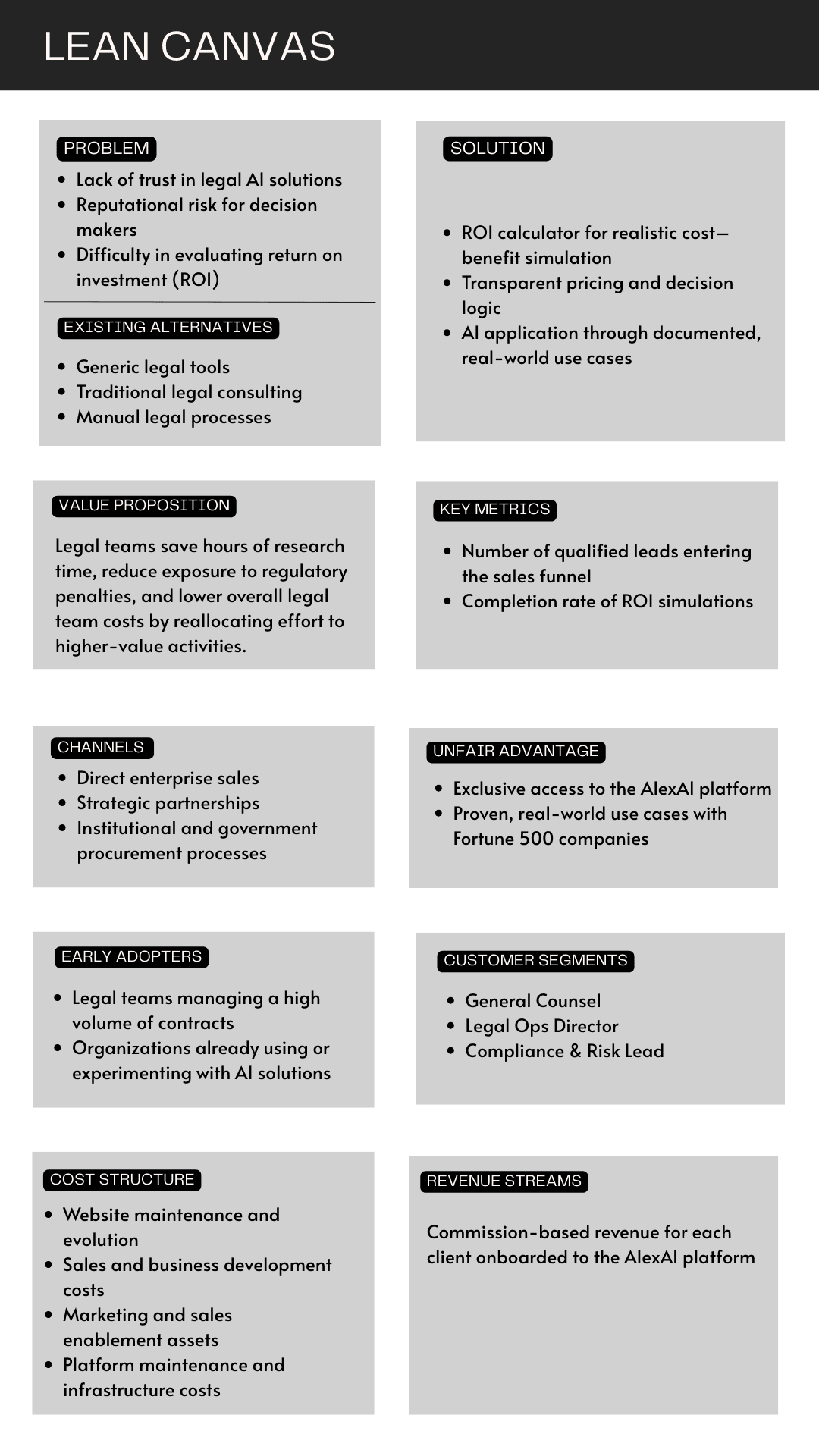 I used a Lean Canvas to align the platform’s architecture with LexAI’s business goals and Fortune 500 legal pain points. This framework allowed me to